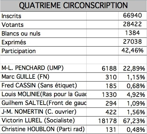 Victorin Lurel élu avec 67,23% des voix dans la quatrième circonscription.