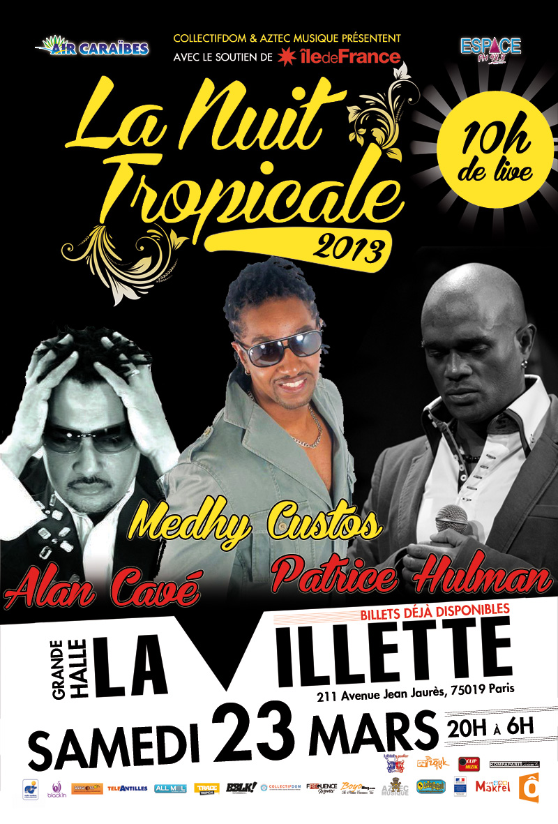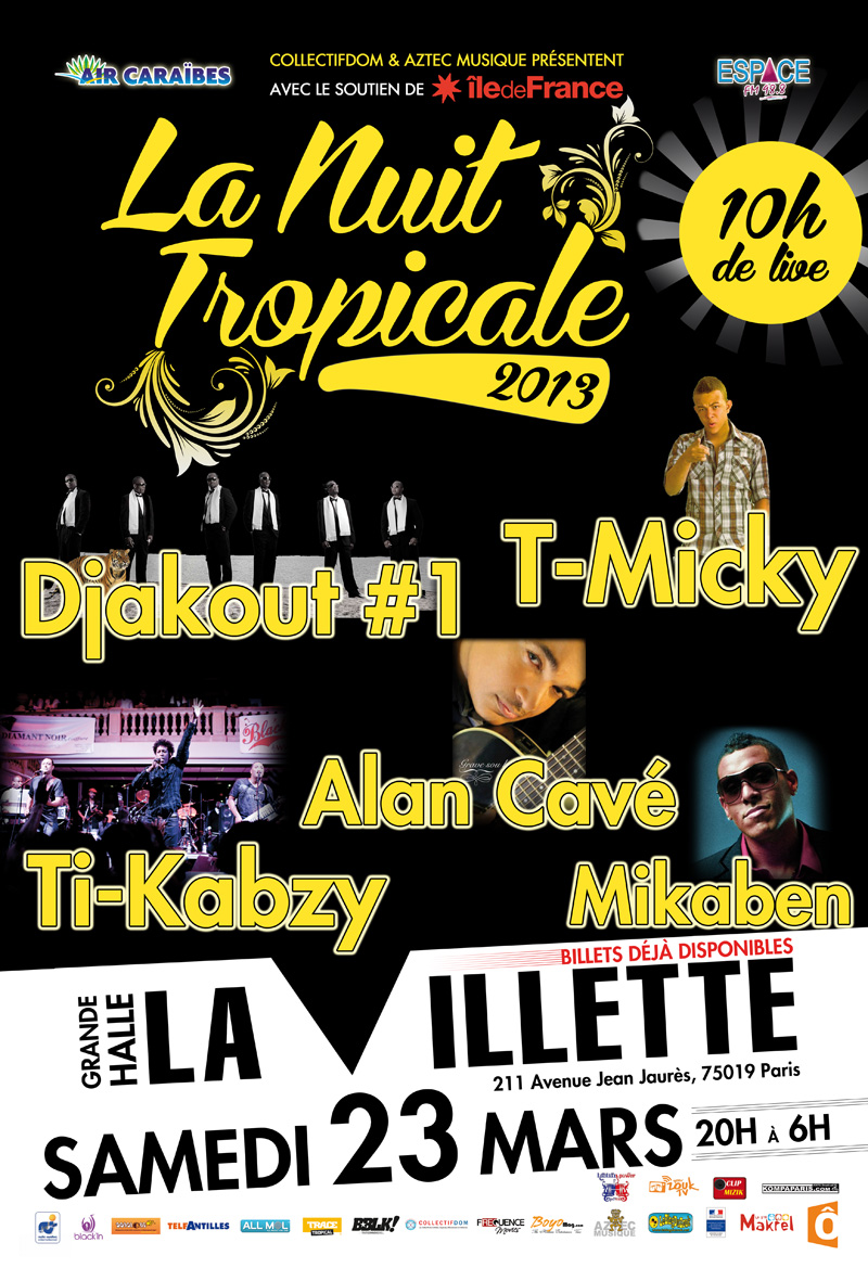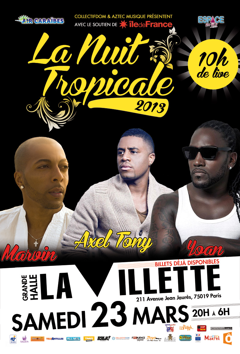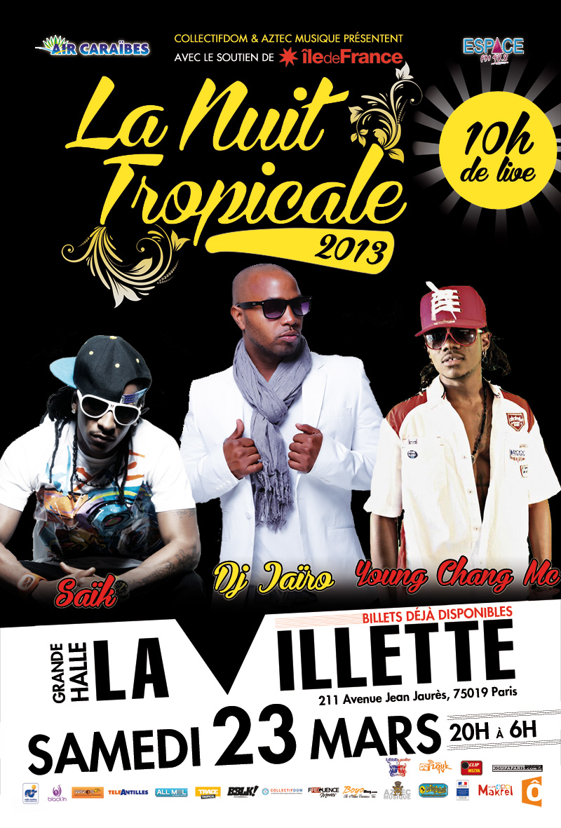 Aztec Music et le Collectif Dom présentent : La Nuit Tropicale, le samedi 23 mars, à la Grande Hall de la Villette à Paris ou s’enchaîneront sur scène des artistes zouk, kompa et dance hall pendant plus de 10 heures non stop en live! L’évènement sera animé par un des plus grand dj de la caraïbe ‘’DJ’S JAIRO’’ et présenté par Jean-Marc Ferdinand un des plus grand showman antillais.