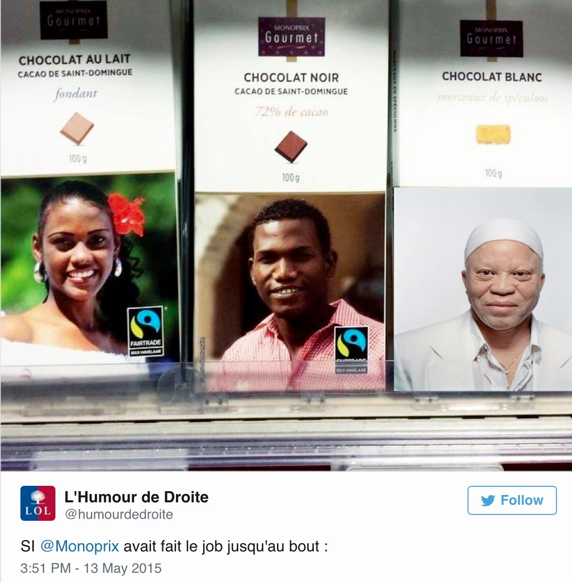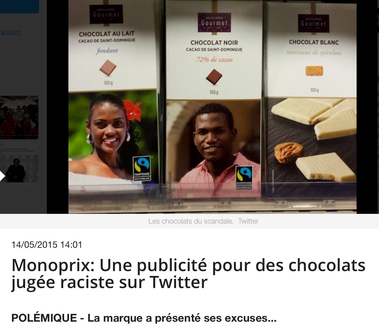 Dans la dernière campagne pour les tablettes de chocolat de la gamme Monoprix Gourmet, le chocolat noir, est illustré par la photo d’un homme noir. Le chocolat au lait, par celle d’une femme noire plus claire de peau. Et le chocolat blanc ? Ben… par du chocolat blanc pardi !