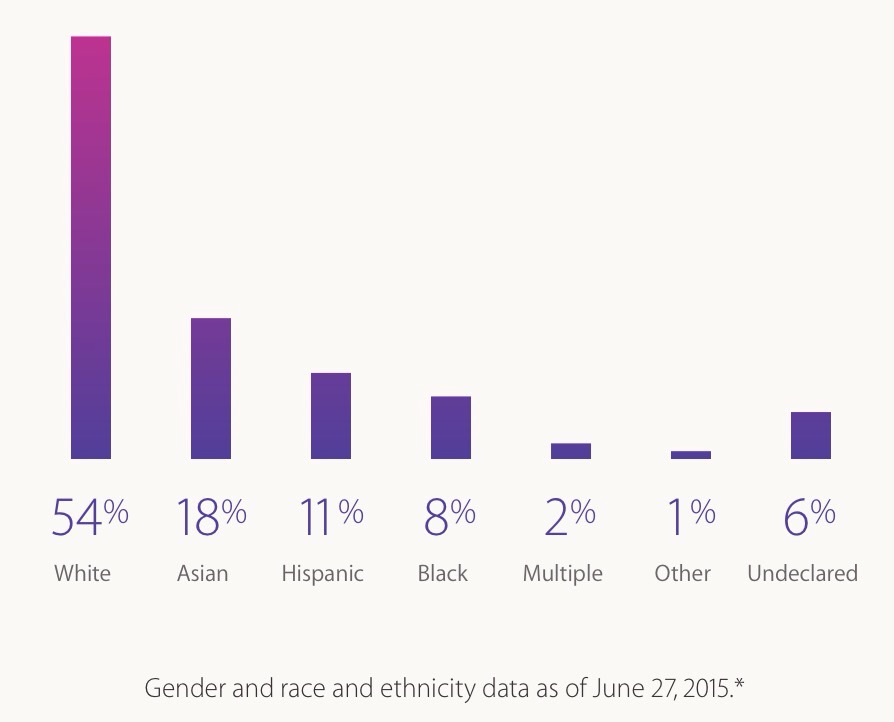 Dans le monde entier, 69% des employés Apple sont des hommes et 31% sont des femmes (70% et 30% en 2014). 54% sont des blancs, 18% sont des asiatiques, 11% sont des hispaniques, 8% sont des noirs, 2% sont notés comme « multiple », 1% comme « autre » et 6% comme « non déclaré ».