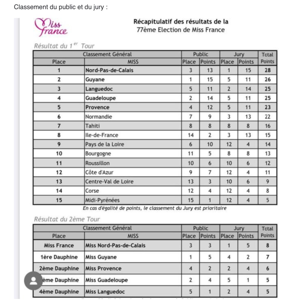 Au moment de dévoiler la grande gagnante de ce concours de beauté suivi par des millions de téléspectateurs, le suspens était à son comble. Miss Languedoc a été appelée comme 4e dauphine, puis Miss Guadeloupe 3e dauphine, Miss Provence 2e dauphine. C’est Miss Nord-Pas-De-Calais qui a remporté la couronne de cette 94e édition du concours Miss France, laissant la place de 1re dauphine à Miss Guyane.
