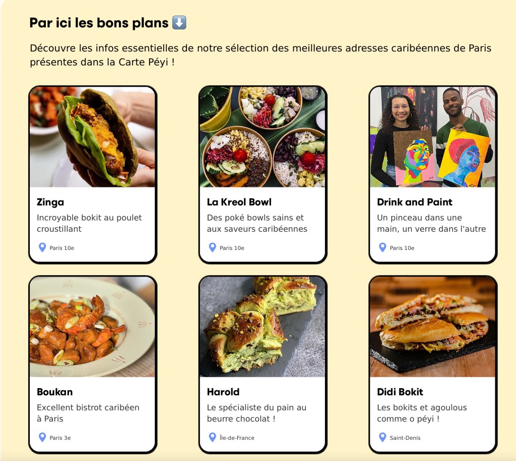 « On a vraiment tout testé, sinon on ne l’aurait pas proposée. Il y a des bokits, agoulous, du poulet boucané, des poké bowls aux saveurs afro-caribéennes… En terme d’activité, il y a par exemple des cours de zouk ou kompa gouyad… Il y a un mix de tout ce que l’on peut trouver à Paris et à proximité. »