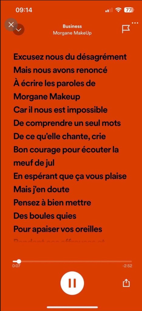 « Insolite mais vrai. Non, vous ne pourrez pas fredonner les paroles de Business, la dernière chanson de Morgane Makeup, en l’écoutant sur Spotify. En effet, la plateforme de streaming musical a décidé de ne pas traduire les paroles du morceau. « Les paroles qui vont suivre ne sont qu’une retranscription de ce qu’on peut comprendre. Il y a beaucoup de charabias, mais c’est ce qui se rapproche le plus.» 20 minutes
