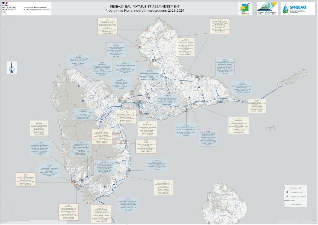 Ce PPI prévoit un financement de 317 M€ d’investissement pour l’eau et l’assainissement en Guadeloupe, dont 20 M€ du Département et 27 M€ de l’Office de l’eau, 20 M€ de la Région et 73 M€ du Feder, et 83 M€ de l’État.
