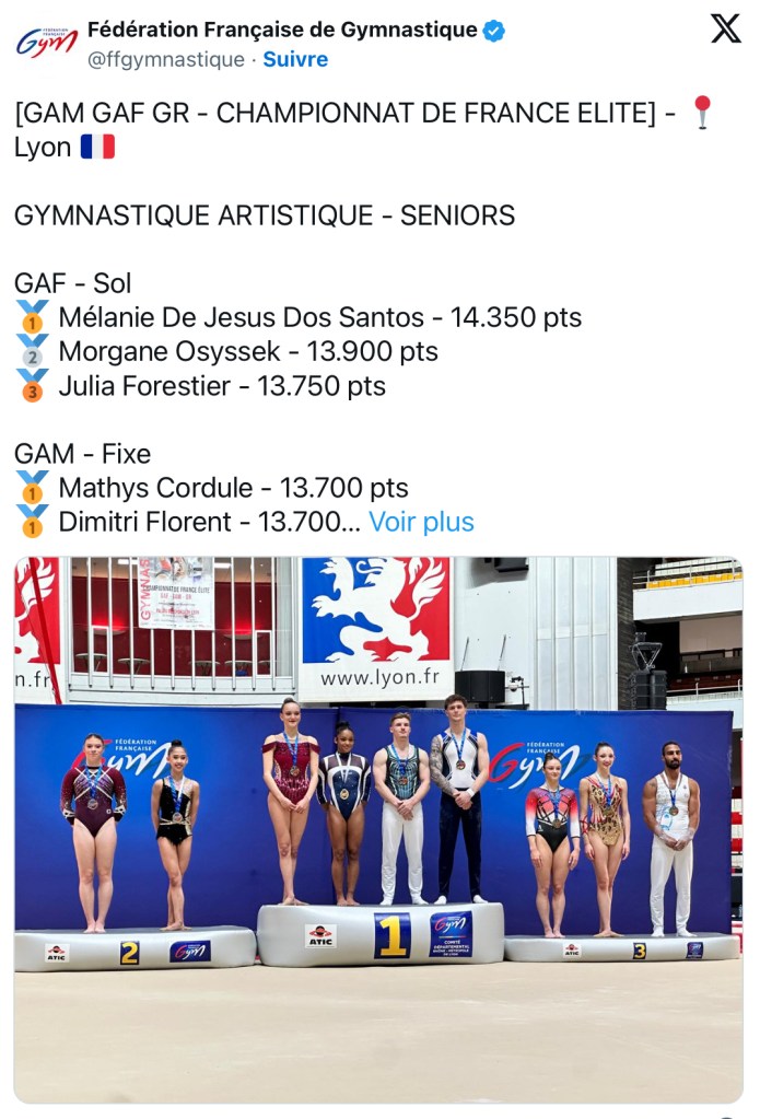 Au lendemain de son quatrième titre de championne de France du concours général, la Martiniquaise Mélanie De Jesus Dos Santos s’est imposée à la poutre et au sol dimanche à Lyon, à moins de deux mois des Jeux olympiques de Paris. Après une décevante 5e place aux barres asymétriques, la gymnaste de 24 ans s’est offert le titre national à la poutre (14.150 pts), puis au sol (14.350 pts) et termine donc ces championnats avec trois médailles d’or, de bon augure avant les JO. France Info