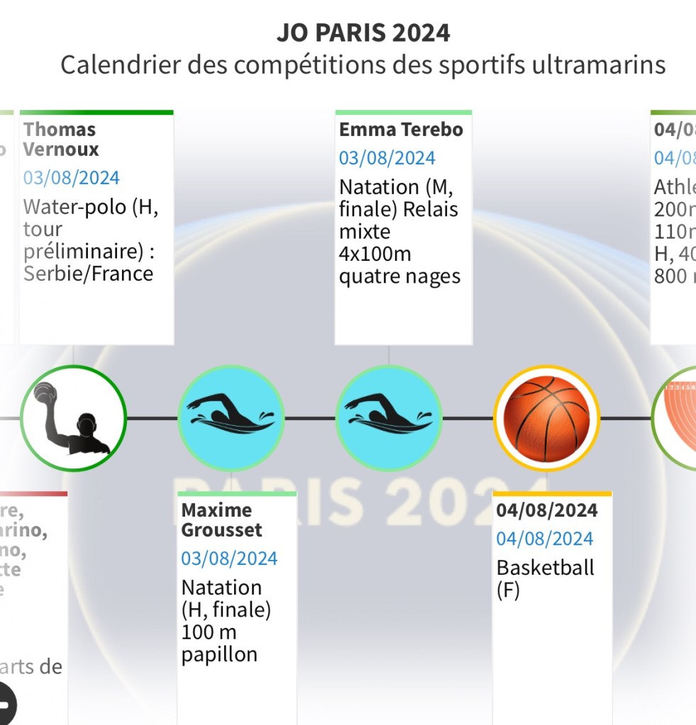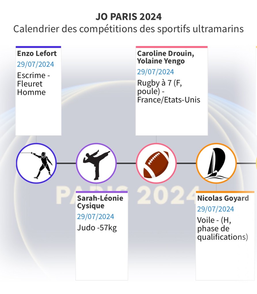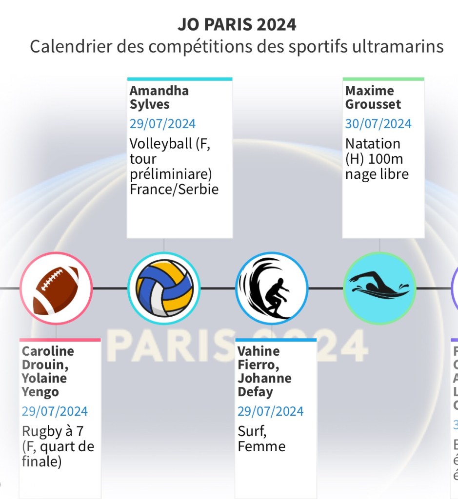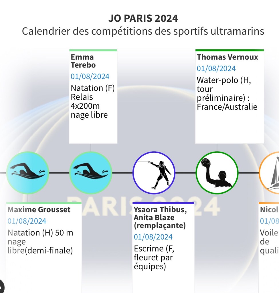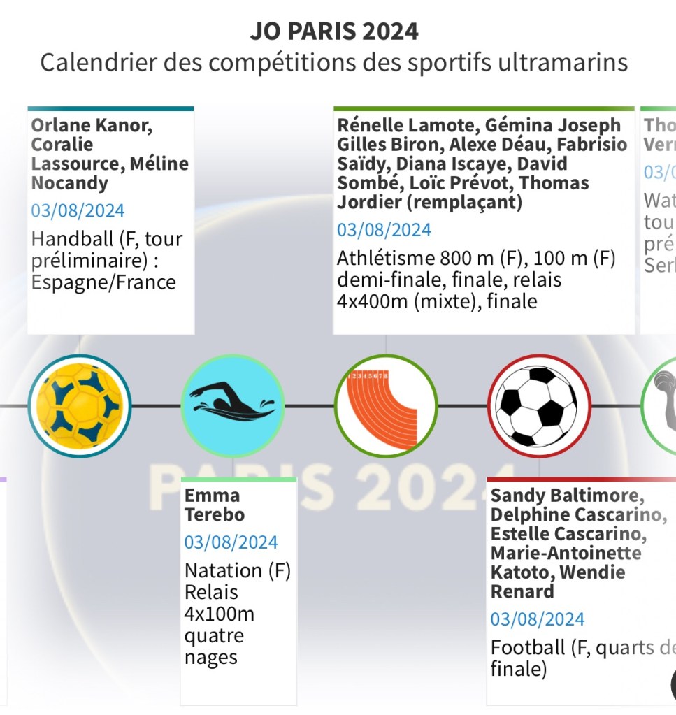 Pour vous permettre de ne rien rater de ces rendez-vous et encourager les Ultramarins, nous vous proposons ce calendrier hebdomadaire consultable aussi en plein écran. Il vous permettra de suivre au plus près les performances de nos sportifs et de les encourager au quotidien.