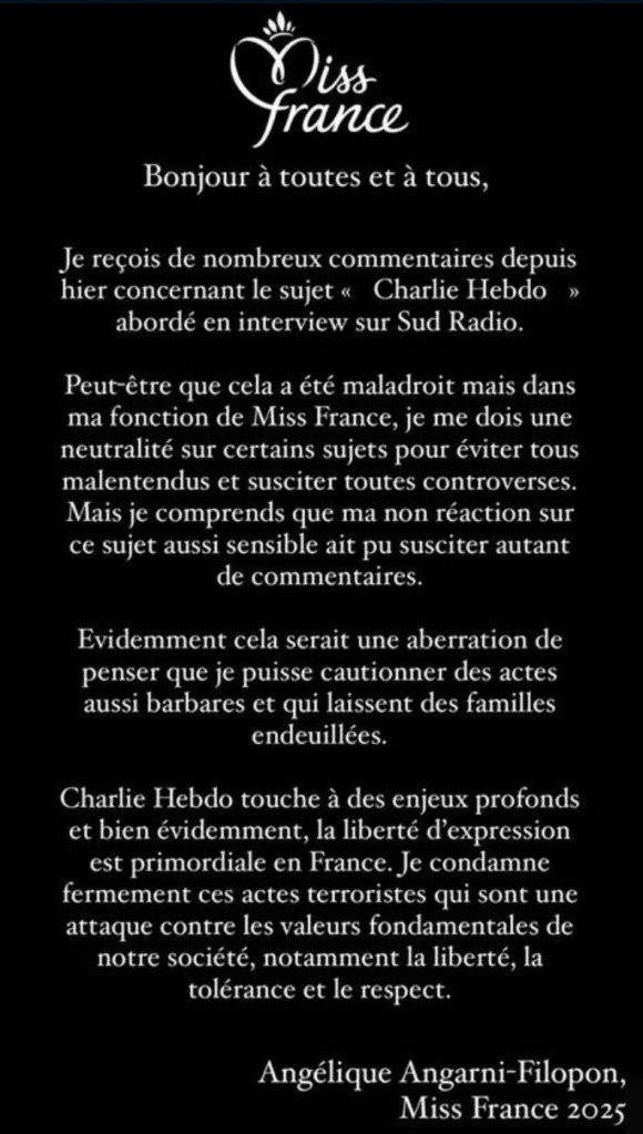 Angélique Angarni-Filopon, Miss France 2025, est vivement critiquée depuis un passage à la radio où elle a refusé de dire, si oui ou non, elle était Charlie.